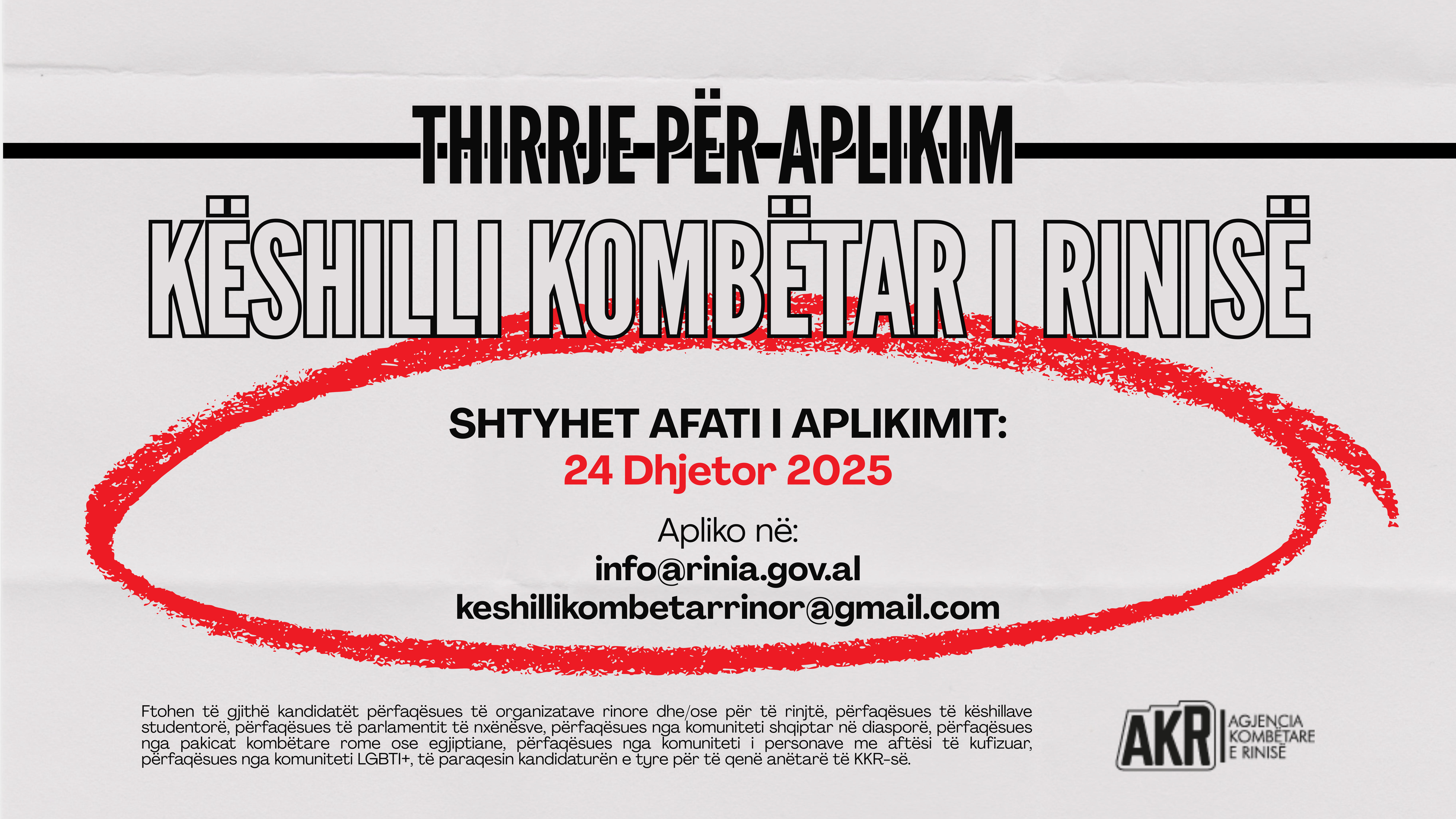 AGJENCIA KOMBËTARE E RINISË Agjencia Kombëtare e Rinisë shpall thirrjen e tretë për krijimin e Këshillit Kombëtar Rinor (KKR), si organ këshillimor, që funksionon pranë Ministrit përgjegjës për rininë. Ftohen të gjithë kandidatët përfaqësues të organizatave rinore dhe/ose për të rinjtë, përfaqësues të këshillave studentorë, përfaqësues të parlamentit të nxënësve, përfaqësues nga komuniteti shqiptar në […]