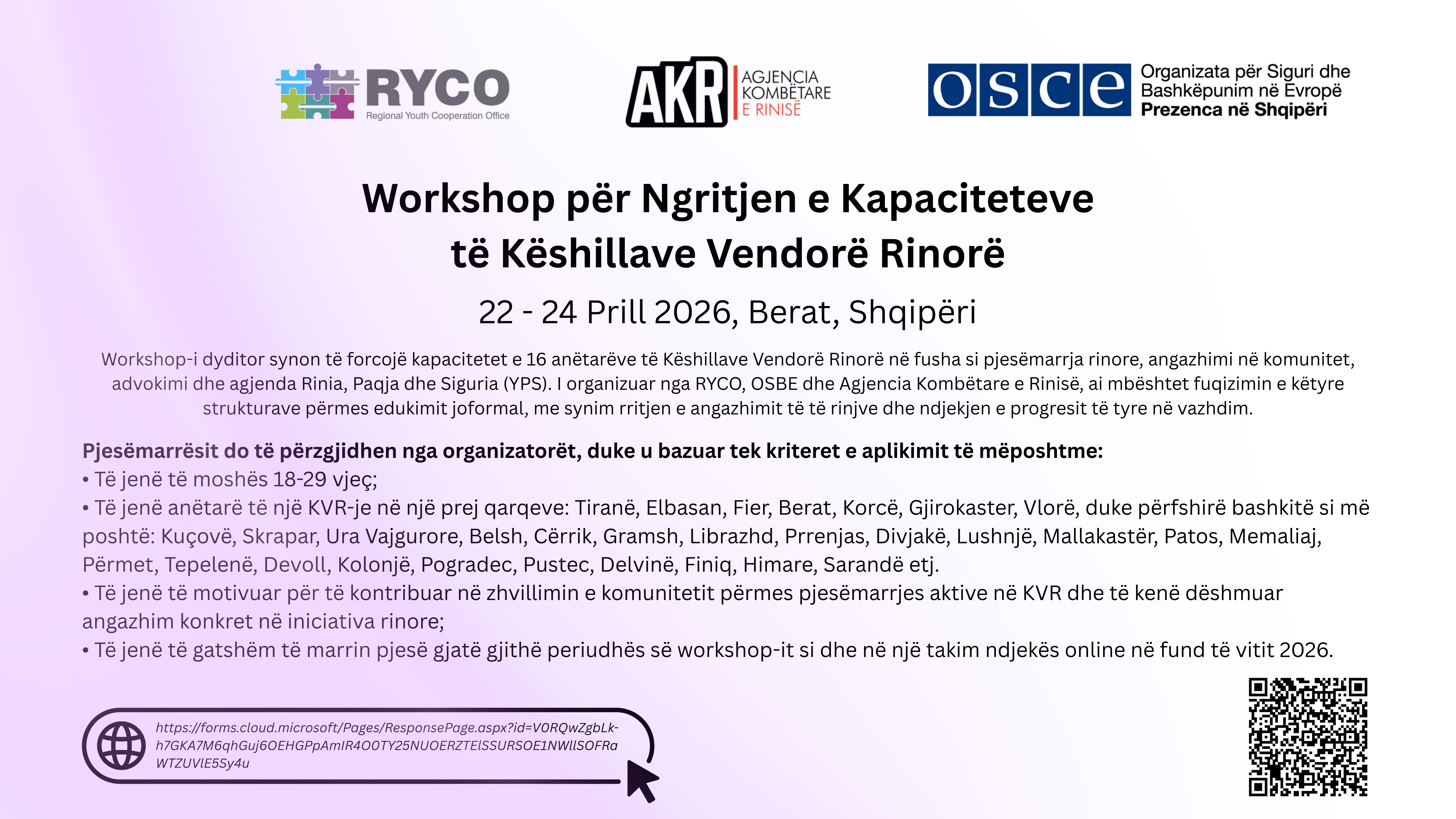 Workshop-i për ngritjen e kapaciteteve të Këshillave Vendorë Rinorë (KVR) është një aktivitet dyditor që synon të forcojë kapacitetet e 16 anëtarëve të KVR-ve në fusha kyçe si: pjesëmarrja rinore, angazhimi në komunitet, strategjitë e advokimit dhe agjenda Rinia, Paqja dhe Siguria (YPS). Në përputhje me Ligjin për Rininë, çdo bashki në Shqipëri ka ngritur […]